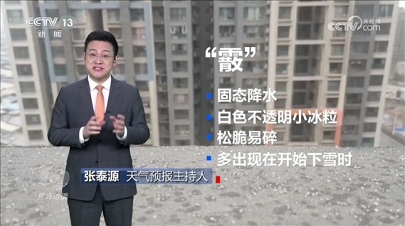 天氣預報主持人張?zhí)┰矗骸啊薄且环N固態(tài)降水,由白色不透明的小冰粒組成,近似球形,有時呈圓錐形,有雪狀結構,通常在地面氣溫不太冷時降落,在剛開始下雪的時候出現?!?/p>