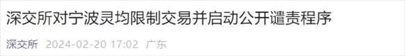 根據(jù)深交所《限制交易實(shí)施細(xì)則》《自律監(jiān)管措施和紀(jì)律處分實(shí)施辦法》等相關(guān)規(guī)定,深交所決定,從2024年2月20日起至2024年2月22日止對(duì)寧波靈均名下相關(guān)證券賬戶采取限制交易措施,限制其在上述期間買賣在深交所上市交易的所有股票,并啟動(dòng)對(duì)寧波靈均公開譴責(zé)紀(jì)律處分的程序。