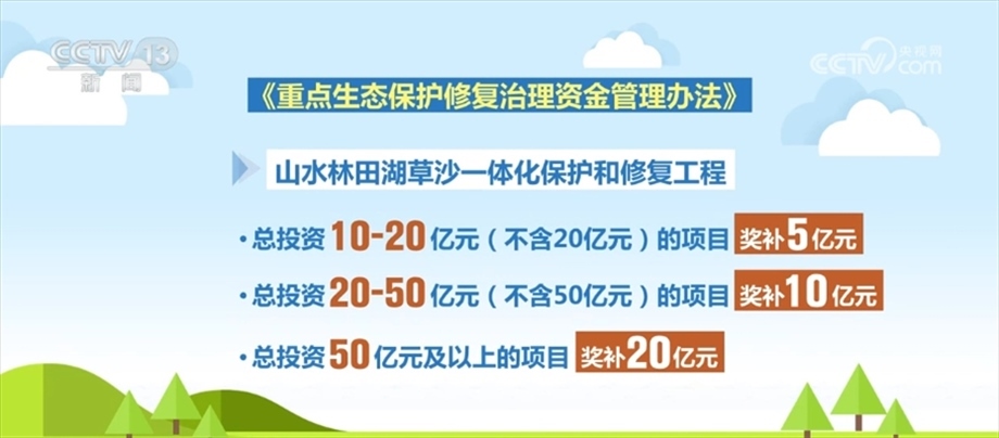 資金具體怎么分配?新辦法指出,山水林田湖草沙一體化保護(hù)和修復(fù)工程總投資10億元—20億元(不含20億元)的項(xiàng)目獎補(bǔ)5億元;工程總投資20億元—50億元(不含50億元)的項(xiàng)目獎補(bǔ)10億元;工程總投資50億元及以上的項(xiàng)目獎補(bǔ)20億元。歷史遺留廢棄工礦土地整治總投資5億元及以上的項(xiàng)目獎補(bǔ)3億元。