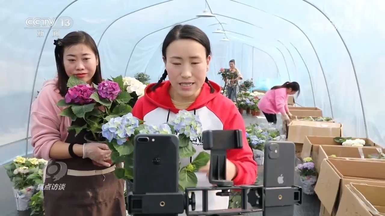 江蘇省宿遷市沭陽(yáng)縣是全國(guó)聞名的“花木之鄉(xiāng)”,也是江蘇省面積最大的花木生產(chǎn)縣。近年來(lái),沭陽(yáng)進(jìn)一步完善“互聯(lián)網(wǎng)+三農(nóng)”模式,依托本地花木特色優(yōu)勢(shì)和電商先發(fā)優(yōu)勢(shì),持續(xù)壯大花木電商,推動(dòng)產(chǎn)業(yè)迭代升級(jí)。每天晚上,走進(jìn)沭陽(yáng)縣新河鎮(zhèn)主播之家的盆景基地,都能看到一片熱鬧的場(chǎng)景。臺(tái)上一名拍賣師,臺(tái)下五十多名網(wǎng)絡(luò)主播同時(shí)直播,一邊與粉絲互動(dòng),一邊幫忙喊價(jià)。在沭陽(yáng)的各個(gè)溫室大棚,也經(jīng)常能看到農(nóng)戶在帶貨直播,在這里,手機(jī)變身為“新農(nóng)具”、直播變成了“新農(nóng)活”。