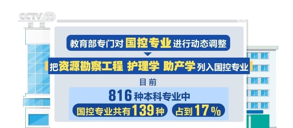此次教育部專門對國控專業(yè)進行了動態(tài)調(diào)整,把資源勘察工程、護理學、助產(chǎn)學列入了國控專業(yè)。目前,816種本科專業(yè)中,國控專業(yè)共有139種,占到17%。未來,國控專業(yè)范圍還將進行“有進有出”的動態(tài)調(diào)整。