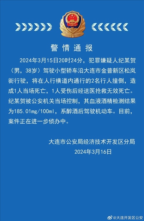 ·男子醉駕致2人死亡,大連警方通報。