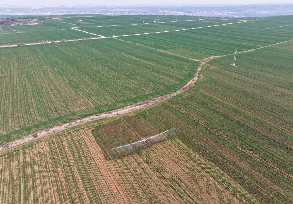 3月6日,在西安市長(zhǎng)安區(qū)神禾塬萬畝優(yōu)質(zhì)糧食生產(chǎn)基地,長(zhǎng)豐農(nóng)機(jī)專業(yè)合作社使用淋灌機(jī)澆灌小麥(無人機(jī)照片)。新華社記者邵瑞 攝