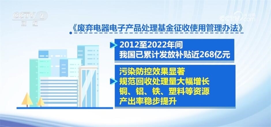我國(guó)設(shè)立“廢棄電器電子產(chǎn)品處理基金”,用于補(bǔ)貼回收處理廢棄電器電子產(chǎn)品。根據(jù)《廢棄電器電子產(chǎn)品處理基金征收使用管理辦法》,2012至2022年間,我國(guó)已累計(jì)發(fā)放補(bǔ)貼近268億元,污染防控效果顯著,規(guī)范回收處理量大幅增長(zhǎng),銅、鋁、鐵、塑料等資源產(chǎn)出率穩(wěn)步提升。