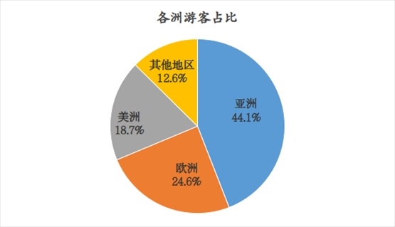 一、近程市場恢復(fù)良好。港澳臺地區(qū)游客恢復(fù)速度較快,合計為9.5萬人次,恢復(fù)到2019年的80.1%。游客占比方面,亞洲游客(不包括港澳臺地區(qū))占比為44.1%,較2019年提升7.2個百分點(diǎn),東南亞地區(qū)游客恢復(fù)情況最好,其中主要客源國為馬來西亞、泰國、新加坡。