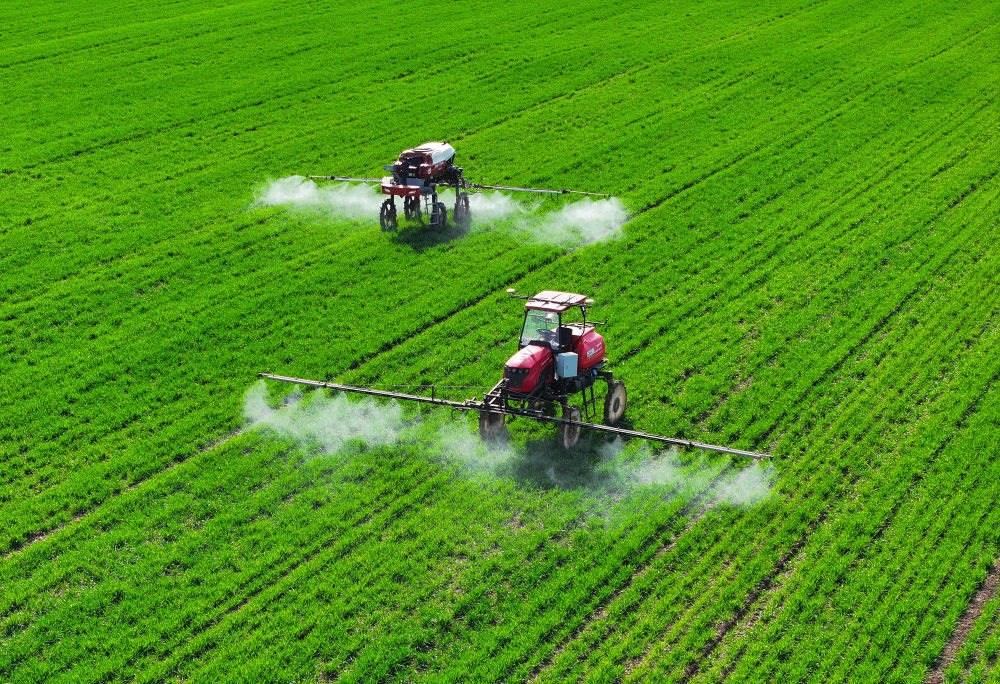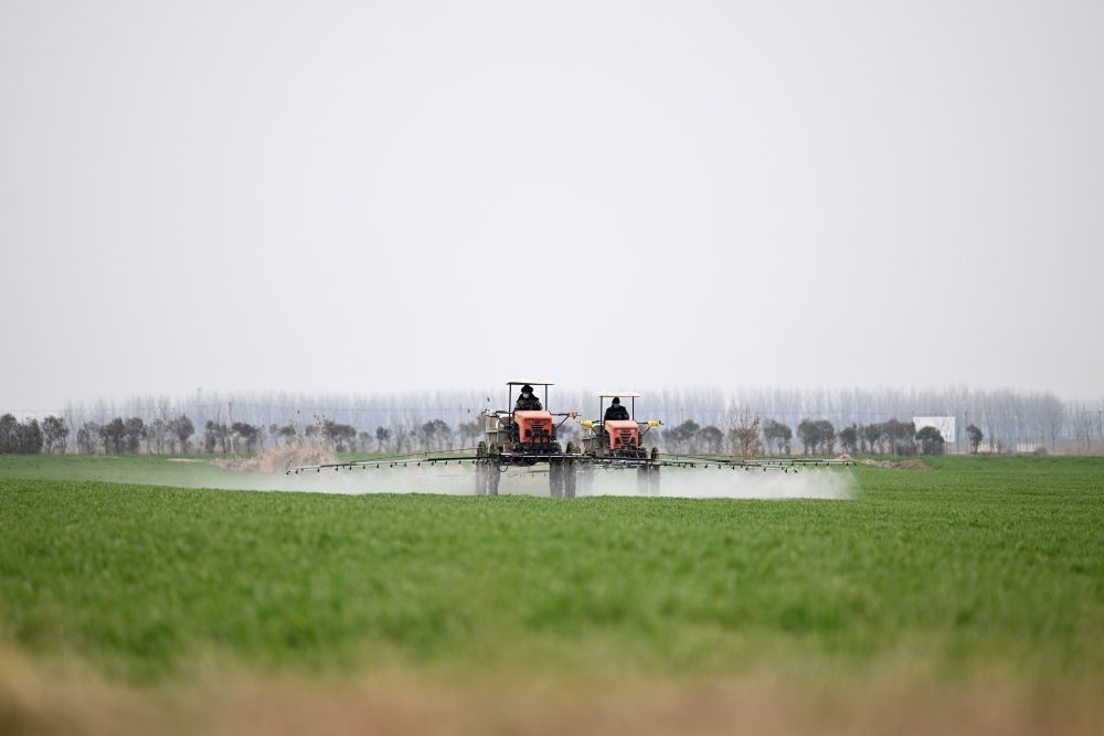 2024年3月13日,在安徽省蚌埠市五河縣頭鋪鎮(zhèn),農(nóng)民駕駛農(nóng)機(jī)給小麥噴灑農(nóng)藥。新華社記者 黃博涵 攝
