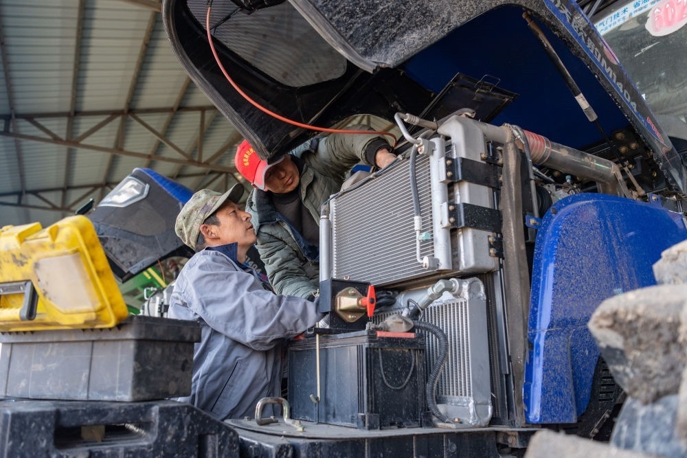 2024年4月3日,在黑龍江省勃利縣一家水稻種植專業(yè)合作社,工作人員在檢修農(nóng)機(jī)。新華社記者 謝劍飛 攝