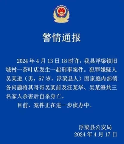 ·警方通報“知名茶企老板一家三口遇害案”:犯罪嫌疑人因家庭內部債務問題將其哥哥吳某前等三名家人殺害后自殺身亡。