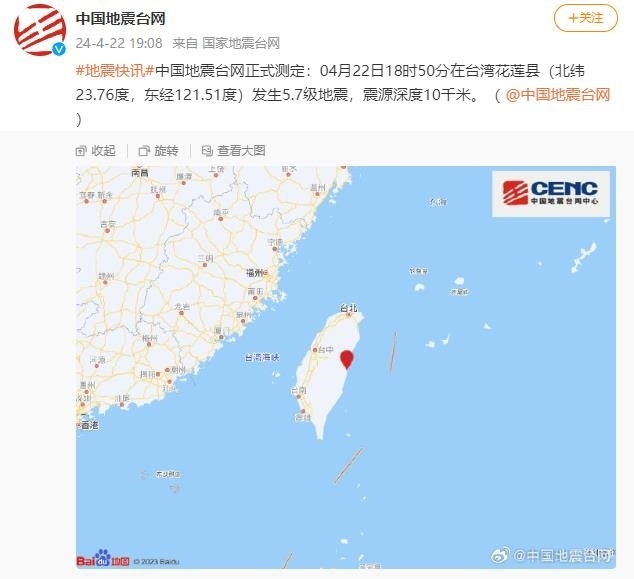 央視網(wǎng)消息:中國(guó)地震臺(tái)網(wǎng)正式測(cè)定:04月22日18時(shí)50分在臺(tái)灣花蓮縣(北緯23.76度,東經(jīng)121.51度)發(fā)生5.7級(jí)地震,震源深度10千米。