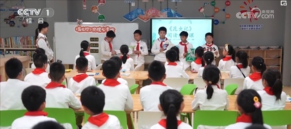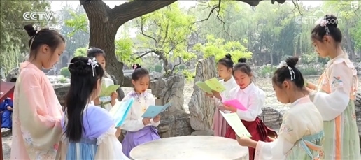 在江西南昌、河北保定,小學(xué)生們踴躍分享讀書心得。大家還走出教室,來到林蔭下、池塘邊,沉浸式誦讀經(jīng)典古詩詞。