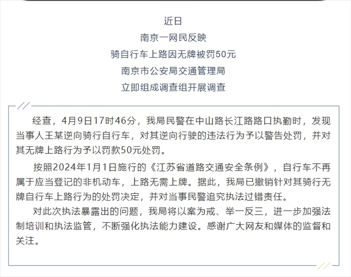 ·南京交警回應市民騎自行車無牌被罰50元:撤銷處罰,追究民警責任。