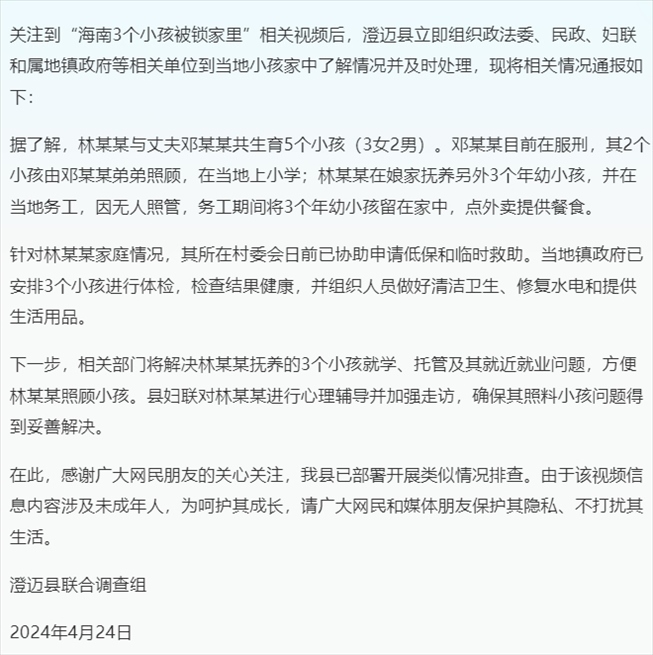 ·官方通報“海南3個小孩被鎖家里”:村委會已協(xié)助申請低保和臨時救助。