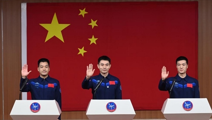 神舟十八號瞄準4月25日20時59分發(fā)射,航天員葉光富(中)、李聰(右)、李廣蘇在酒泉衛(wèi)星發(fā)射中心問天閣與媒體記者集體見面。