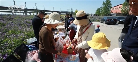 一年前,這里還是一片工地遺留的建筑渣土。當(dāng)?shù)嘏c科研團(tuán)隊合作,引進(jìn)營養(yǎng)土技術(shù),一年內(nèi)就將撂荒地變成了“桃花源”。花海邊還擺起了創(chuàng)意市集,結(jié)合“花”元素的花餑餑、非遺農(nóng)民畫和黑陶工藝品,吸引了不少游客消費(fèi)。