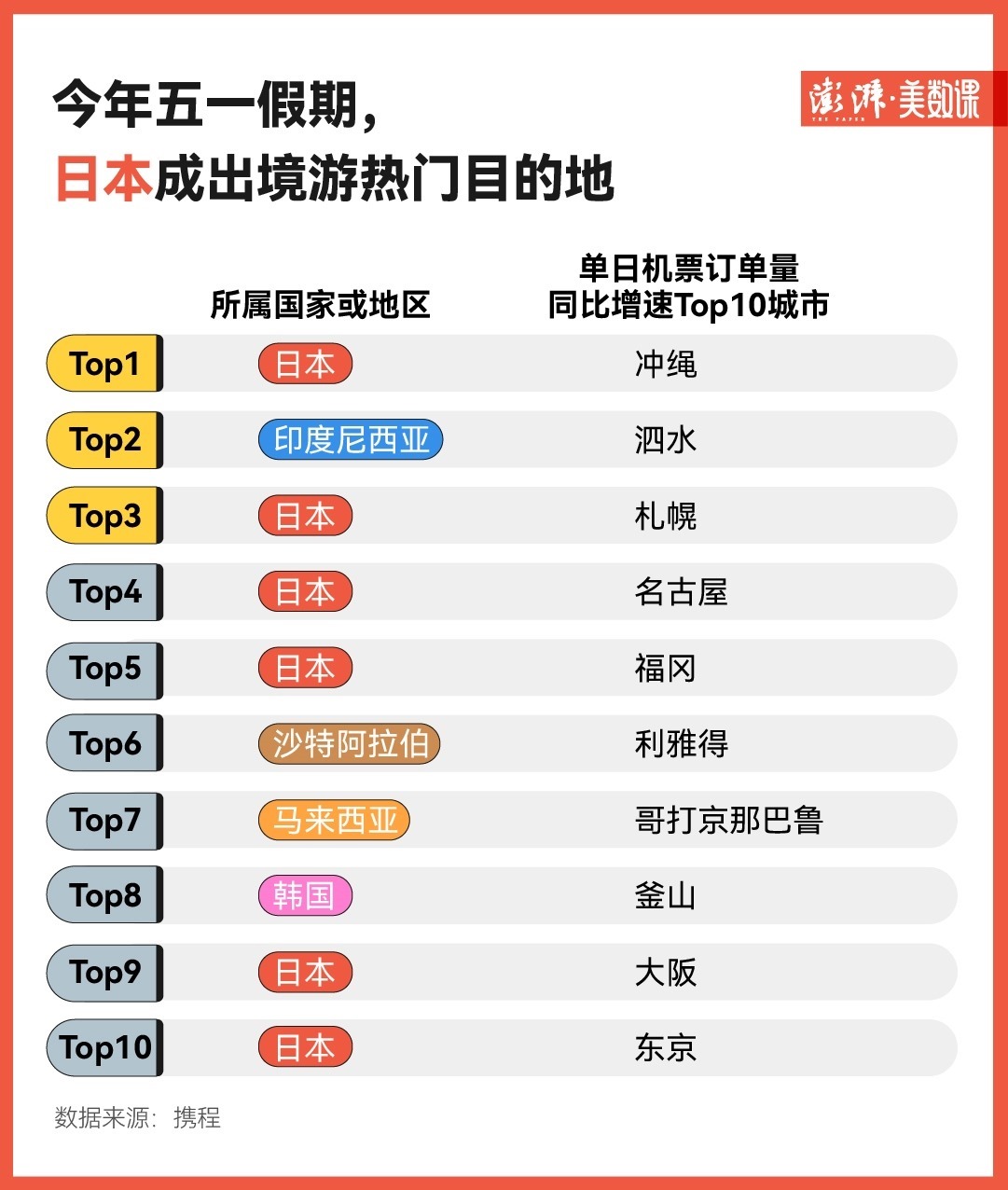 除了國內(nèi)旅游市場的火爆之外,“五一”出境游已經(jīng)加快復(fù)蘇。從攜程提供的數(shù)據(jù)看,今年“五一”假期,日本成了出境游熱門目的地——相比2023年同期,單日機(jī)票訂單量同比增速Top10的城市中,日本的沖繩、札幌、名古屋等城市分別占據(jù)了六個(gè)席位。