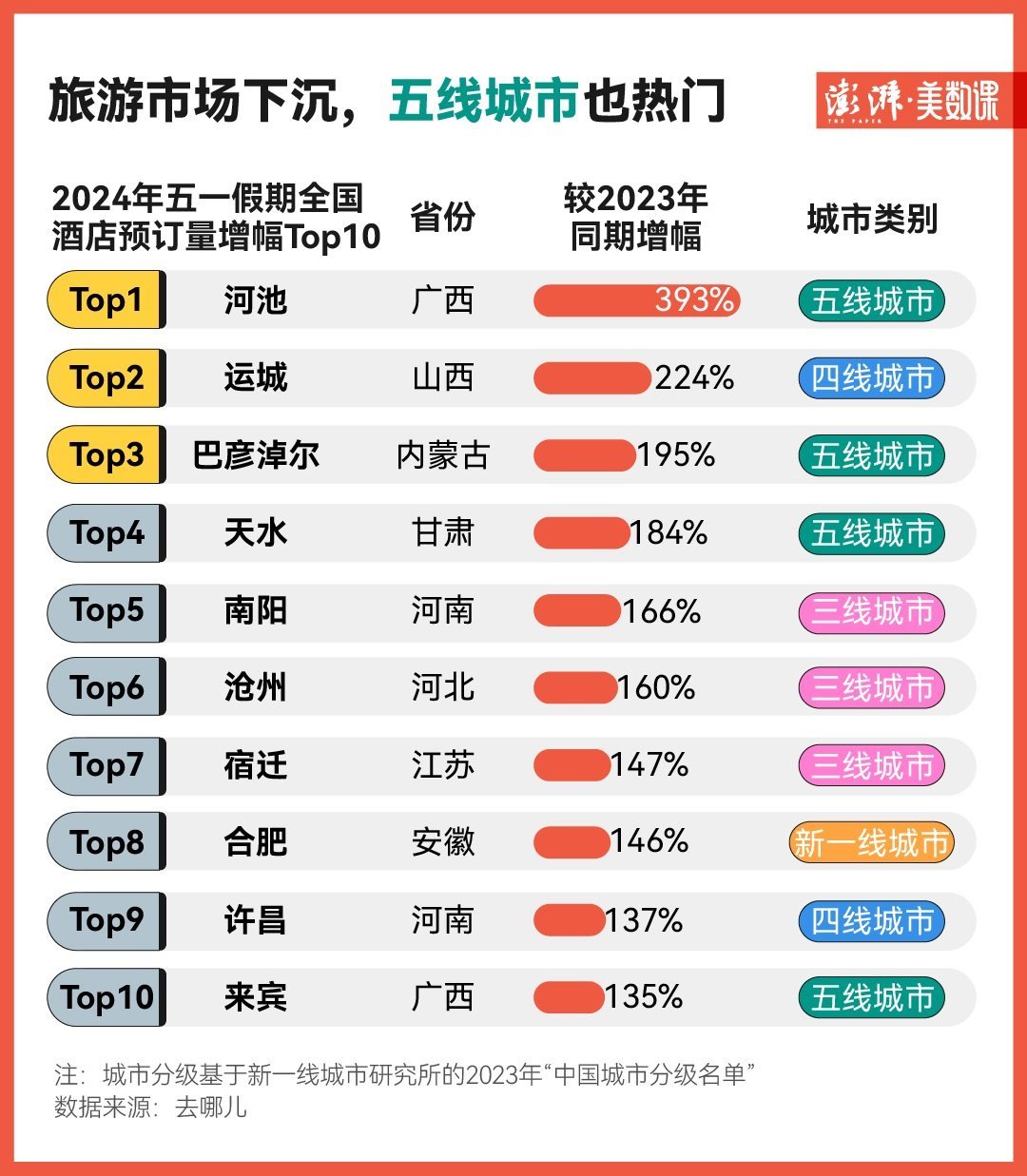 從去哪兒的數(shù)據(jù)來看,這個(gè)假期里酒店預(yù)訂量增幅前十名的城市幾乎都是三線、四線或五線城市,其中五線城市河池以393%的同比增幅領(lǐng)跑全國,其次是山西運(yùn)城、內(nèi)蒙古巴彥淖爾。