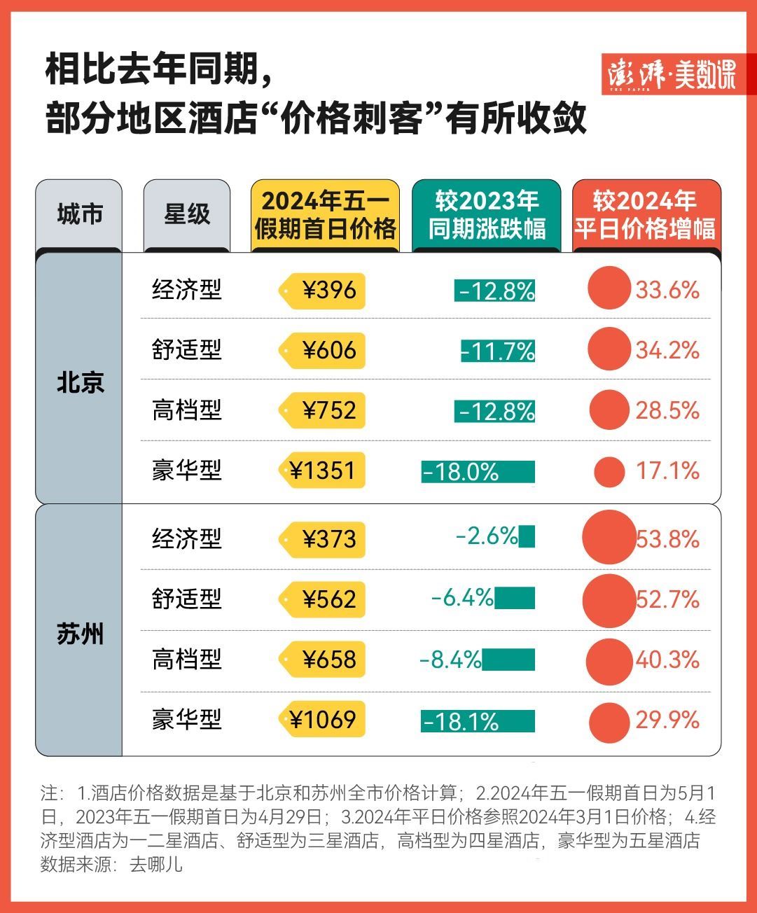 從去哪兒平臺(tái)提供的數(shù)據(jù)來看,在今年“五一”假期的首日,北京和蘇州的經(jīng)濟(jì)型酒店相比平日價(jià)格分別漲了三成和五成左右,難怪在社交媒體上總能看到“五一不是不出門,是酒店住不起”的吐槽聲。