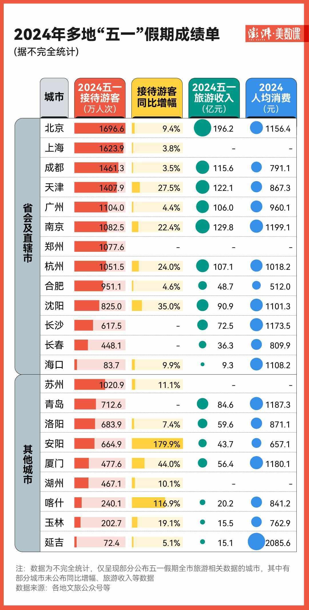 不過,像是北京、上海、成都、天津等城市依然是熱門的旅游目的地。在目前已公布“五一”假期數(shù)據(jù)的省會(huì)及直轄市中,北京、上海就以1696.6萬、1623.9萬接待游客人次名列前茅。