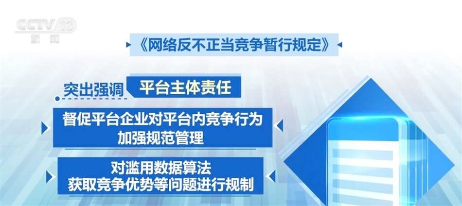 平臺企業(yè)掌握海量數(shù)據(jù),連接大量主體,既是網(wǎng)絡不正當競爭監(jiān)管的重點對象,也是協(xié)同監(jiān)管的關鍵節(jié)點。《規(guī)定》突出強調(diào)了平臺主體責任,督促平臺企業(yè)對平臺內(nèi)競爭行為加強規(guī)范管理,同時對濫用數(shù)據(jù)算法獲取競爭優(yōu)勢等問題進行規(guī)制。
