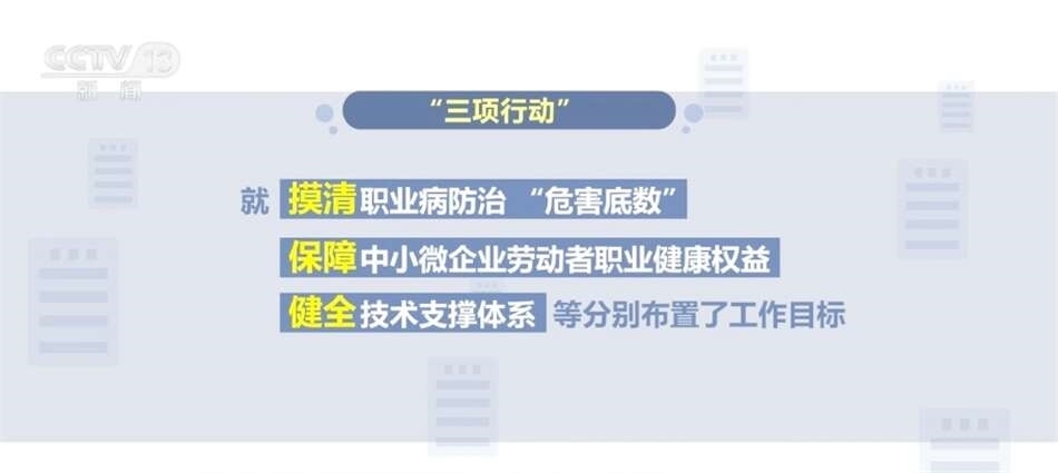 “三項行動”就摸清職業(yè)病防治“危害底數(shù)”、保障中小微企業(yè)勞動者職業(yè)健康權益、健全技術支撐體系等分別布置了工作目標?!叭椥袆印币螅航⒖赡艽嬖诼殬I(yè)病危害的用人單位數(shù)據(jù)庫,確定重點幫扶對象、建立幫扶團隊,2024年和2025年實現(xiàn)每年每省中小微企業(yè)幫扶數(shù)量平均每個縣區(qū)不少于20家;到2025年底,幫扶企業(yè)職業(yè)病危害項目申報率、工作場所職業(yè)病危害因素定期檢測率、職業(yè)健康檢查開展率、職業(yè)健康培訓率均達到100%。