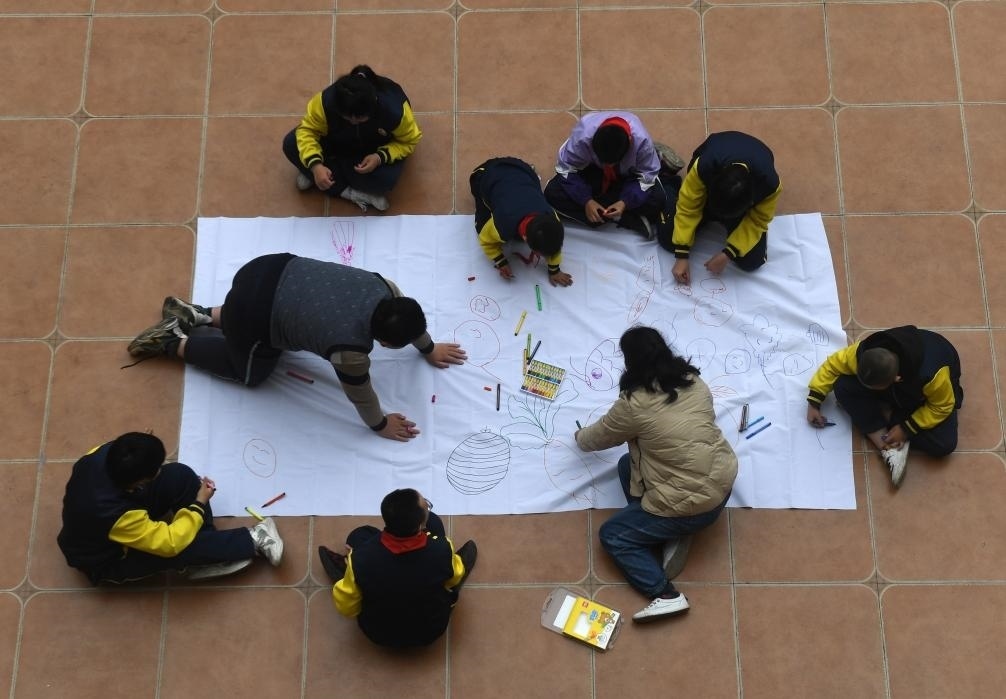 ?↑在廣西南寧高新區(qū)龍華學(xué)校,何冬艷教她照顧的學(xué)生畫(huà)畫(huà)(2023年3月31日攝)。