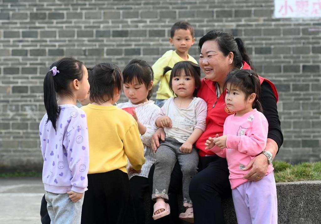 ?↑在廣西賓陽(yáng)縣中華鎮(zhèn)的一個(gè)“留守兒童之家”活動(dòng)室外,張清秀和孩子們交流(2024年3月5日攝)。
