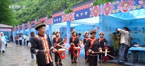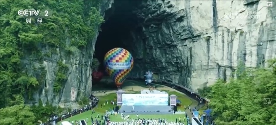 在湖北利川騰龍景區(qū),穿著絢麗多彩的土家族服裝的阿哥阿妹,在億萬(wàn)年前形成的天然溶洞前翩翩起舞、擊鼓迎賓。