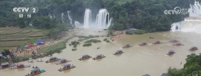 水量大增的瀑布奔騰而下沖擊著河面水聲轟鳴,慕名前來(lái)的游客們或乘坐竹筏感受瀑布的恢弘氣勢(shì),或?qū)ふ易罴褭C(jī)位與瀑布“打卡”合影。除了近距離觀賞德天跨國(guó)瀑布,也有不少游客選擇跨境游玩,站在越南境內(nèi)的板約瀑布看德天瀑布,以不同視角體驗(yàn)中越風(fēng)情。