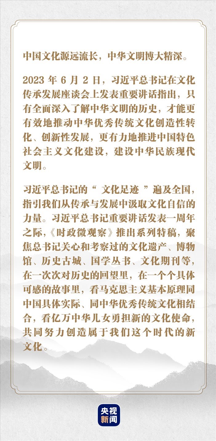 “這段時間,我一直在思考推進中國特色社會主義文化建設(shè)、建設(shè)中華民族現(xiàn)代文明這個重大問題?!?023年6月2日,在文化傳承發(fā)展座談會上,習(xí)近平總書記指出,“只有全面深入了解中華文明的歷史,才能更有效地推動中華優(yōu)秀傳統(tǒng)文化創(chuàng)造性轉(zhuǎn)化、創(chuàng)新性發(fā)展,更有力地推進中國特色社會主義文化建設(shè),建設(shè)中華民族現(xiàn)代文明?!?/p>