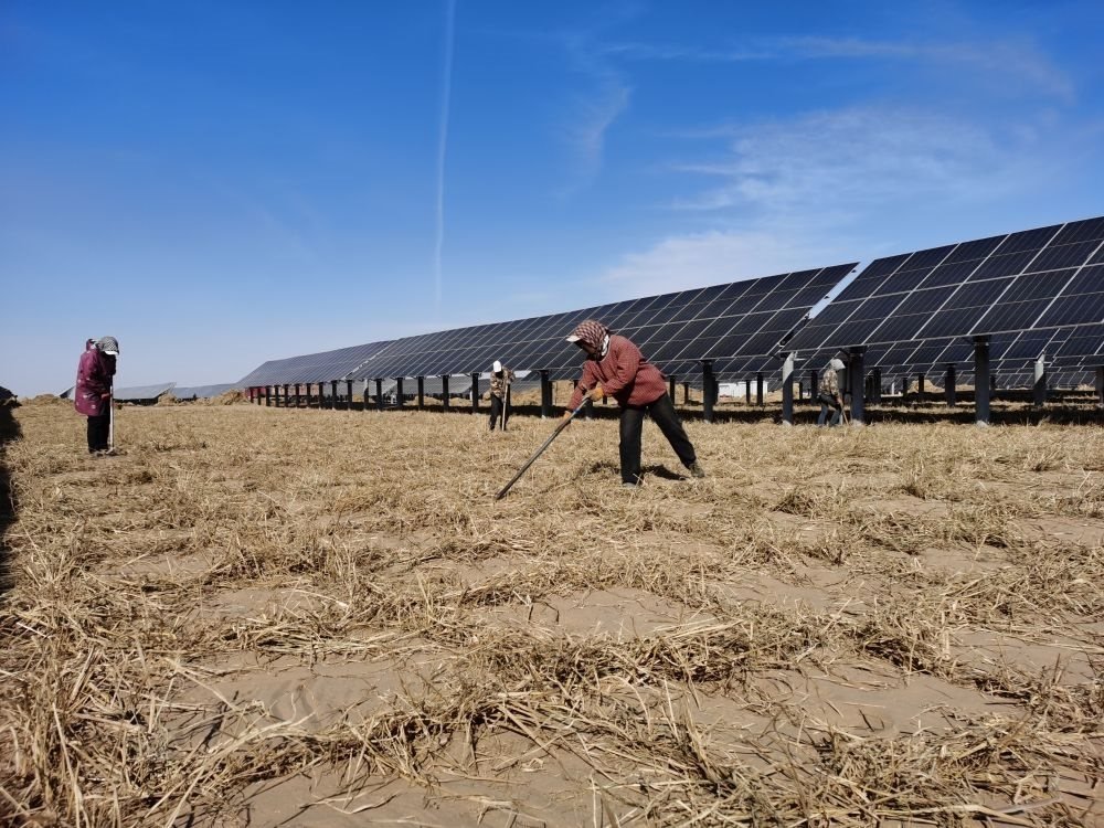 “通過應(yīng)用第三代立體生態(tài)光伏治沙技術(shù),板下可種植四翅濱藜、苜蓿、甘草等灌木、牧草和藥材,沙地綠化率可達(dá)95%,全面建成后可養(yǎng)殖2萬只羊、3萬只雞?!痹趦?nèi)蒙古庫布其光氫治沙新能源有限公司的施工現(xiàn)場,該公司副總工程師杜洪光告訴記者,該項(xiàng)目占地10萬畝,全面建成后,年均可發(fā)電41億千瓦時(shí)。