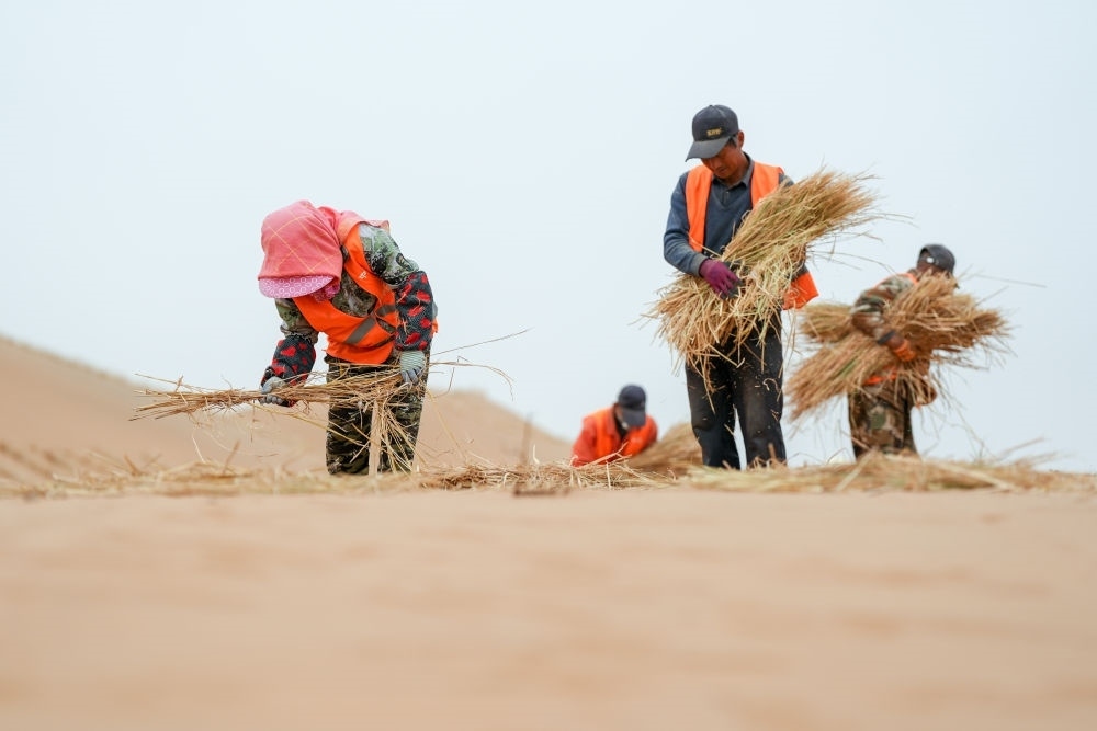 ?2024年4月27日,在內(nèi)蒙古阿拉善左旗騰格里沙漠S315沿線固沙工程現(xiàn)場,治沙工人用稻草在沙漠中扎草方格。新華社記者 連振 攝