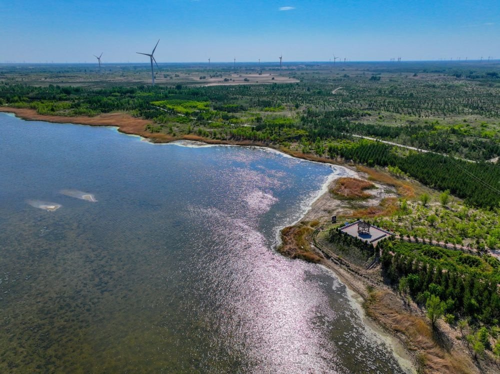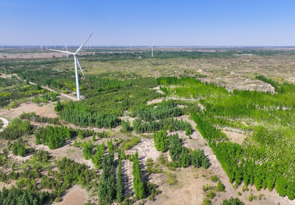 ?這是在內(nèi)蒙古通遼市科爾沁沙地“雙百萬畝”綜合治理工程努古斯臺項(xiàng)目區(qū)拍攝的風(fēng)力發(fā)電機(jī)組(2024年5月15日攝,無人機(jī)照片)。新華社記者 連振 攝