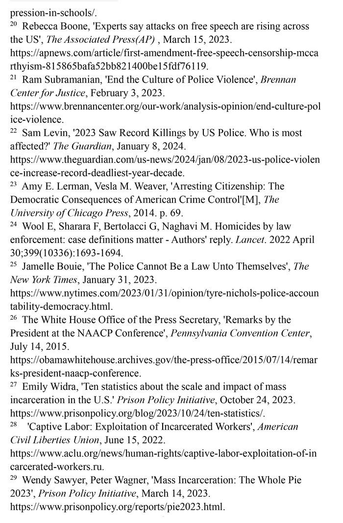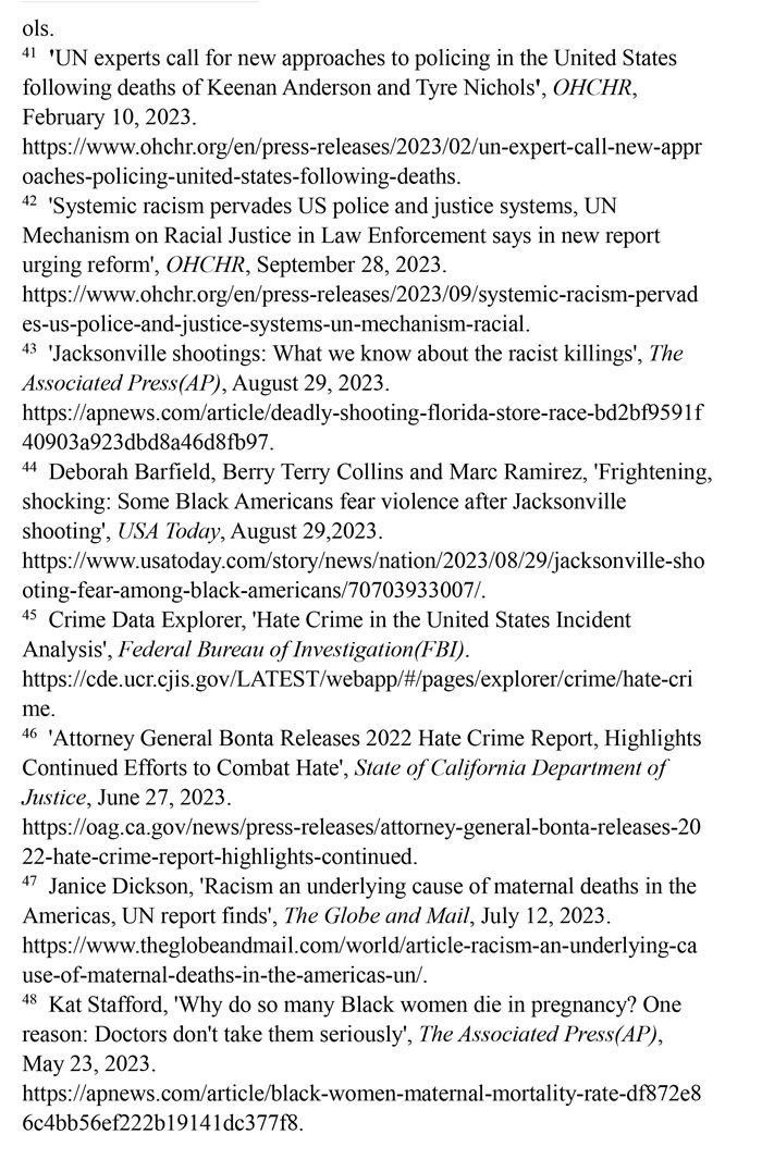 非洲裔在執(zhí)法領域面臨嚴重種族歧視。2023年1月3日,洛杉磯31歲的非洲裔男子基南·安德森涉嫌交通肇事,警方在制服他的過程中使用電擊槍擊中其6次,致其心臟病發(fā),送醫(yī)不治身亡。(注39)2023年1月7日,田納西州孟菲斯市的警察以“魯莽駕駛”為由將29歲的非洲裔男子泰爾·尼科爾斯攔下,并對其進行長達數(shù)分鐘的殘忍毆打。三天后尼科爾斯因傷勢過重去世,而事后的調(diào)查無法證實警察關于其“魯莽駕駛”的說法。(注40)這兩起非洲裔遭受警察暴力執(zhí)法身亡案例引發(fā)多名聯(lián)合國專家的高度關注。專家們強調(diào),在兩起事件中,警察使用的武力違反保護生命權,禁止酷刑和其他殘忍、不人道或有辱人格待遇或處罰的國際準則,也不符合聯(lián)合國《執(zhí)法人員行為守則》和《執(zhí)法人員使用武力和火器的基本原則》。(注41)聯(lián)合國人權理事會在執(zhí)法工作中推進種族正義和平等的國際獨立專家機制在對美國實地訪問后發(fā)布報告指出,針對非洲裔的系統(tǒng)性種族主義已經(jīng)滲透到美國警察隊伍和刑事司法系統(tǒng)。非洲裔被警察殺害的可能性是白人的3倍,被監(jiān)禁的可能性是白人的4.5倍。在每年1000多起警察殺人案件中,只有1%的涉事警察被指控。報告警告說,美國如果不按照國際標準改革警察使用武力的規(guī)則,許多殺戮將繼續(xù)發(fā)生。(注42)
