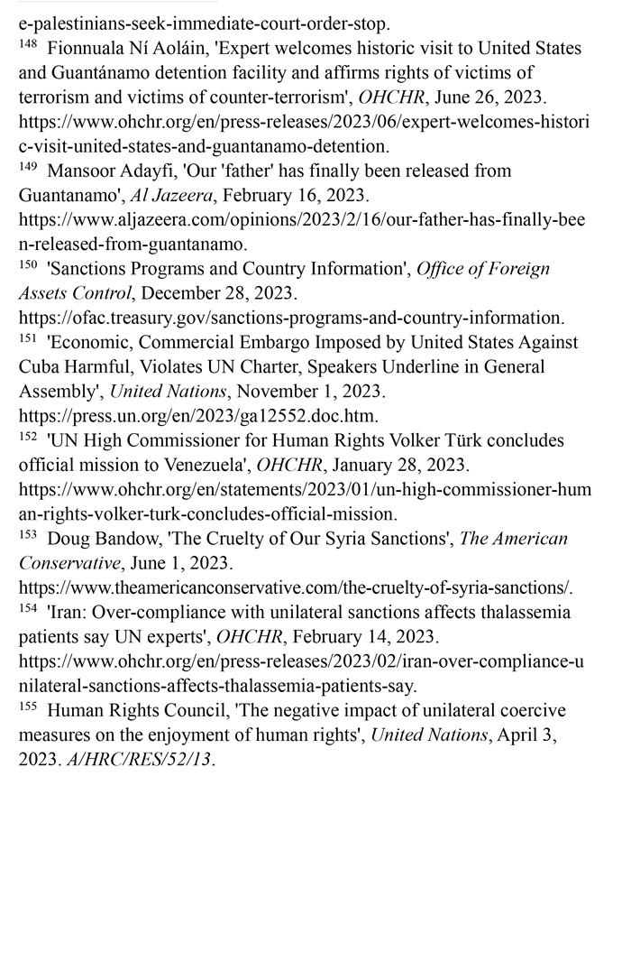 長期濫施單邊制裁造成嚴重人道主義后果。自1950年以來,美國使用的制裁次數(shù)居全球之首。根據(jù)美國財政部2023年12月28日公布的數(shù)據(jù),美國制裁的國家超過20個。(注150)第78屆聯(lián)合國大會發(fā)言人2023年11月1日指出,美國對古巴實施的經(jīng)濟、商業(yè)和金融封鎖違反了《聯(lián)合國憲章》,對古巴人民造成了毀滅性影響。(注151)聯(lián)合國大會2023年11月2日通過決議,再次敦促美國終止對古巴長達60多年的經(jīng)濟、商業(yè)和金融封鎖,這是聯(lián)合國大會連續(xù)第31年通過類似決議。2023年1月28日,聯(lián)合國人權事務高級專員沃爾克·圖爾克在訪問委內(nèi)瑞拉后表示,2017年以來美國施加的制裁加劇了委內(nèi)瑞拉的經(jīng)濟危機,嚴重阻礙人權的實現(xiàn)。(注152)“美國保守派”網(wǎng)站2023年6月1日報道,美國制裁進一步加劇了敘利亞人民的貧困。敘利亞70%的人口面臨食物短缺,其中1200萬人三餐不繼,290萬人食不果腹。(注153)聯(lián)合國人權理事會單邊強制措施對人權負面影響問題特別報告員阿萊娜·杜晗2023年2月14日指出,美國對伊朗的制裁減少了地中海貧血癥患者從國外進口救命藥物的機會,導致伊朗患者的并發(fā)癥和死亡率增加,是對健康權的侵犯。(注154)聯(lián)合國人權理事會2023年4月3日通過決議指出,單邊強制性措施會對目標國家廣大民眾的人權產(chǎn)生深遠影響,對窮人和處境最脆弱的人影響尤為嚴重。決議譴責某些大國繼續(xù)單方面適用單邊強制性措施。美國在該決議表決中投了反對票。(注155)