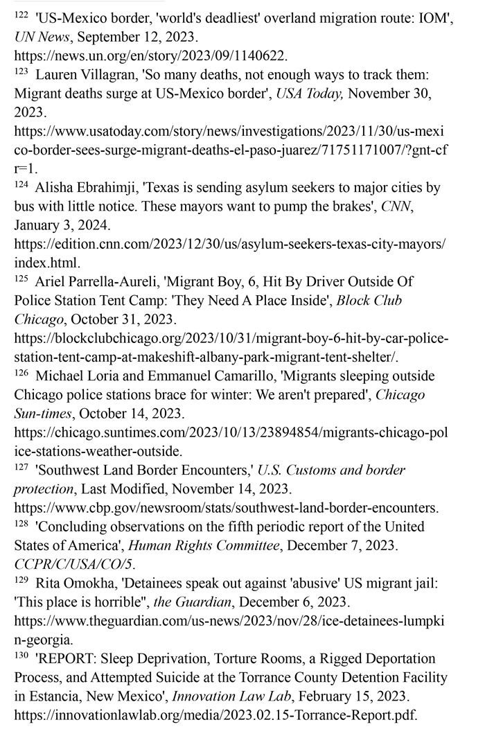 入境移民遭受酷刑及其他不人道待遇。2023財年,在美國南部邊境遭逮捕或驅(qū)逐的移民總數(shù)達240多萬人,再創(chuàng)歷史新高。(注127)聯(lián)合國人權事務委員會對移民在美國受到長時間的拘留表示擔憂,批評美國的拘留所條件惡劣,人滿為患,被拘押者無法獲得食物、水和醫(yī)療服務,導致包括兒童在內(nèi)的許多人死亡;公共和私營移民拘留設施存在性暴力、長期單獨監(jiān)禁、虐待等侵犯人權問題。(注128)英國《衛(wèi)報》網(wǎng)站2023年12月6日報道,由美國私人監(jiān)獄公司CoreCivic運營的、位于佐治亞州蘭普金的斯圖爾特拘留中心存在長期單獨監(jiān)禁、性虐待、醫(yī)療疏忽以及強迫勞動等令人擔憂的問題。(注129)創(chuàng)新法律實驗室于2023年2月15日發(fā)布報告揭露,由CoreCivic運營的、位于新墨西哥州埃斯坦西亞的托蘭斯縣拘留所存在對被關押者實施酷刑現(xiàn)象。在夜間,每隔15分鐘就會有一名警衛(wèi)開著收音機的最大音量走過這些房間,大聲地敲著門,并用手電筒強光照進房間,吵醒任何可能睡著的人。在寒冷的天氣里,每個房間的通風管道整夜都在吹冷空氣。一些人試圖用衛(wèi)生紙或毯子蓋住通風口,但警衛(wèi)們拿走了用來阻擋冷空氣的任何東西。這些牢房里,廁所污水和糞便溢出,人們被迫睡在臭氣熏天的地板上。(注130)