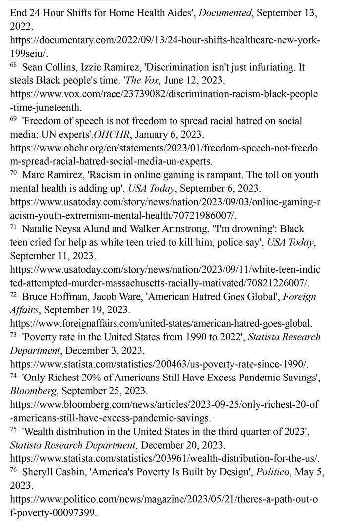 少數(shù)族裔遭遇職場歧視。美國一家名為“溫室”的招聘軟件公司發(fā)布的《2023年求職者面試經(jīng)歷報告》顯示,招聘過程中的歧視現(xiàn)象“相當令人擔憂”。34%的求職者在面試中遇到過歧視性問題,近1/5的求職者曾試圖通過在簡歷中更改姓名,以避免受歧視性招聘行為的影響。在改名的求職者中,有45%是為了讓自己聽起來“不那么有族裔特點”。(注65)英國《衛(wèi)報》網(wǎng)站2023年4月23日披露,美國政府數(shù)十年來刻意逃避勞工保護責任,壓榨少數(shù)族裔勞工。紐約的有色族裔護工不僅被迫接受連續(xù)長時間的工作,薪資還受到克扣。不少護工因此罹患失眠、慢性病等疾病,對護工及其家庭造成嚴重傷害。(注66)少數(shù)族裔勞工一直嘗試通過各種渠道爭取權利保障,但在一些利益集團阻礙下成效寥寥。(注67)沃克斯新聞網(wǎng)2023年6月12日報道,在美國,非洲裔一直比白人掙得少。這種差異意味著在種族歧視的影響下,非洲裔時間價值明顯低于白人,為了彌補歧視造成的工資差距,非洲裔工人每天必須多工作2.7小時。(注68)