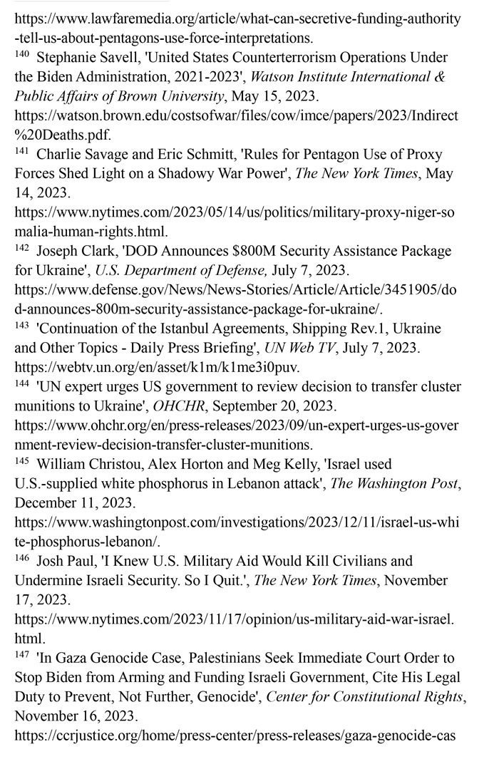 持續(xù)向沖突地區(qū)提供武器。美國國防部2023年7月7日發(fā)布的新聞稿顯示,美國向烏克蘭提供的價值8億美元的額外軍事援助中,包含大量集束彈藥。(注142)聯(lián)合國秘書長副發(fā)言人哈克2023年7月7日回答記者提問時表示,聯(lián)合國秘書長安東尼奧·古特雷斯希望各國遵守《集束彈藥公約》,不要在戰(zhàn)場上繼續(xù)使用集束彈藥。(注143)聯(lián)合國人權高專辦網(wǎng)站2023年9月20日報道,聯(lián)合國人權理事會酷刑和其他殘忍、不人道或有辱人格的待遇或處罰問題特別報告員愛麗絲·吉爾·愛德華茲2023年7月向美國政府發(fā)出緊急信函,警告集束彈藥會對平民造成嚴重傷害。(注144)《華盛頓郵報》網(wǎng)站2023年12月11日報道,美國每年流入以色列的軍火達數(shù)十億美元,以色列在10月對黎巴嫩南部的一次襲擊中使用了美國供應的白磷彈藥,造成至少9名平民受傷。(注145)美國國務院政治軍事事務局前局長喬?!けA_2023年10月18日在《紐約時報》網(wǎng)站發(fā)表專欄文章指出,美國每年向以色列提供至少38億美元軍事援助,加沙地帶最嚴重的人員傷亡大多是由美國提供的彈藥所導致,譴責這種軍事援助無視人權問題。(注146)美國人權組織“憲法權利中心”2023年11月16日報道,滅絕種族與死刑問題專家威廉·沙巴斯指責美國未能履行防止種族滅絕的法律義務,違反了習慣國際法和《防止及懲治滅絕種族罪公約》。(注147)