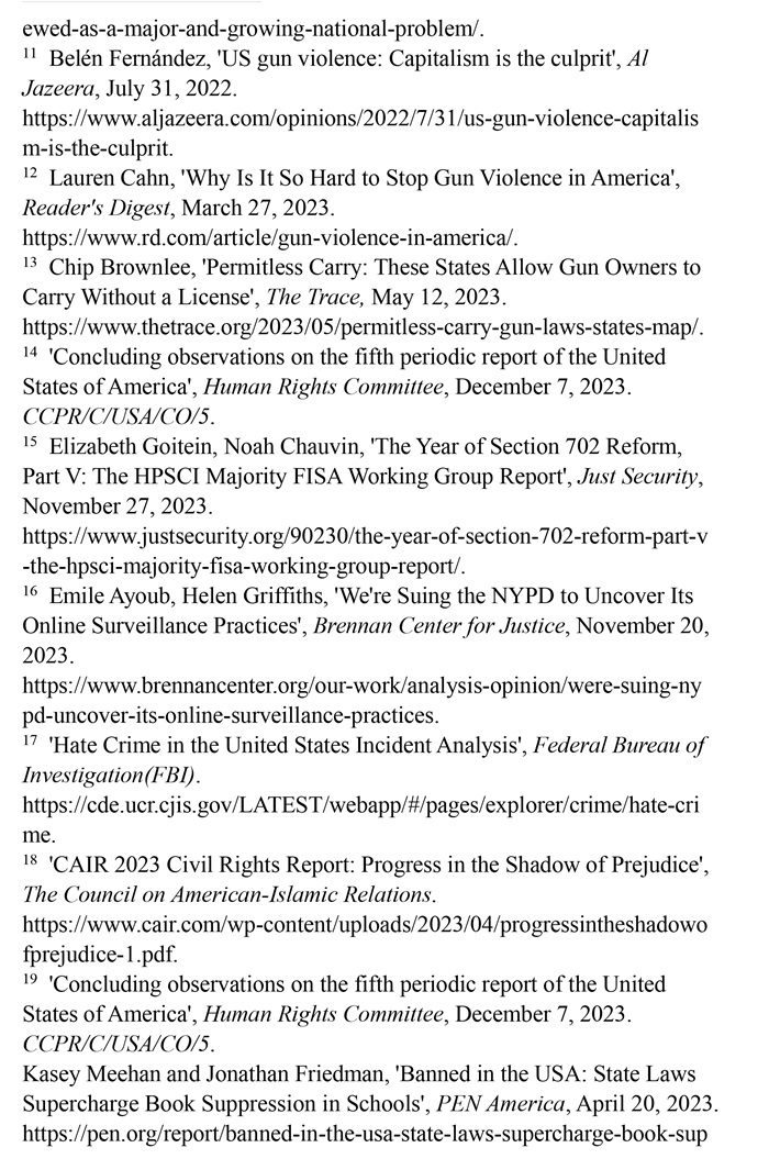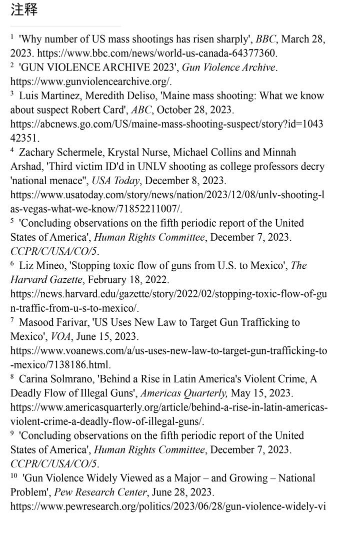 槍支暴力造成慘痛生命代價。數(shù)據(jù)顯示,美國所有類型的槍支暴力事件都呈上升趨勢。(注1)根據(jù)“槍支暴力檔案”網(wǎng)站統(tǒng)計的數(shù)據(jù),2023年美國至少發(fā)生了654起大規(guī)模槍擊事件。槍支暴力導致近4.3萬人死亡,平均每天死亡117人。(注2)例如,美國廣播公司新聞網(wǎng)站2023年10月28日報道,緬因州發(fā)生大規(guī)模槍擊事件,造成至少18人死亡,13人受傷。(注3)《今日美國報》網(wǎng)站2023年12月6日報道,拉斯維加斯3名大學教授被一名前同事槍殺。美國大學教授協(xié)會主席艾琳·馬爾維稱,槍支暴力是“不可接受的國家威脅”,敦促美國政府進行槍支政策改革。(注4)美國與槍支有關的傷亡人數(shù)激增,引發(fā)聯(lián)合國人權事務委員會的嚴重關切。(注5)