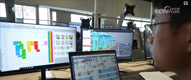 作為系統(tǒng)優(yōu)化師,范春奇全神貫注地盯著3個屏幕。左邊屏幕是碼頭調(diào)度指令,右邊是現(xiàn)場監(jiān)控的實時畫面,中間是智能水平運輸系統(tǒng),顯示著所有車輛的運行軌跡。