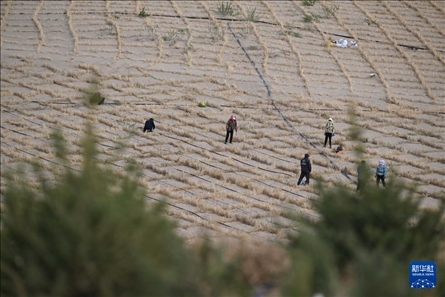 在其白線沙地綜合治理工程項目區(qū),記者跟隨治沙隊伍在松軟的沙丘上迎坡徒步前行,每走一步,退后半步,沙粒灌滿鞋履。然而,來自當(dāng)?shù)氐闹紊橙罕妳s早已習(xí)慣,他們兩三人一組,配合默契,有人拉著稻草橫放鋪平,有人則用工具按壓培土,還有人跟在后面,在鋪好的草方格里撒下草籽。“最高峰的時候每天有上千人參與治沙,推進速度很快?!眲h(huán)宇介紹,今年以來全旗已完成26.5萬畝的治沙任務(wù)。