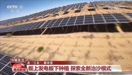 總臺(tái)記者 李欣蔓:治沙的腳步不但沒有停,還在不斷探索新的治沙模式。現(xiàn)在我們看到的是鄂爾多斯一個(gè)已經(jīng)建好、并網(wǎng)發(fā)電的光伏項(xiàng)目,板上發(fā)電,板下種植,一個(gè)空間全方位利用。三重防線,構(gòu)建起了全新的生態(tài)治沙模式。有一個(gè)數(shù)據(jù)值得我們關(guān)注,這里的光伏項(xiàng)目占地39萬畝,與此同時(shí),生態(tài)治理面積也將規(guī)劃完成39萬畝。在國家推進(jìn)光伏治沙項(xiàng)目開發(fā)建設(shè)的進(jìn)程中,我們看到越來越多的企業(yè)參與其中,在發(fā)展新能源產(chǎn)業(yè)的同時(shí)共同擔(dān)負(fù)起治沙的責(zé)任,為一片藍(lán)海,一片綠洲的建設(shè),貢獻(xiàn)更多的力量。