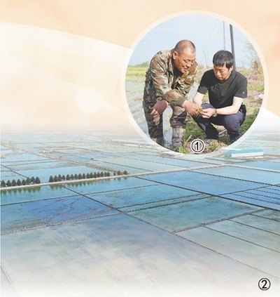 圖①:于海河(右)在田間地頭和村民一起查看水稻長勢。 本報記者 方 圓攝圖②:完成了機械化插秧的水稻田?;⒘质形麄鞑抗﹫D