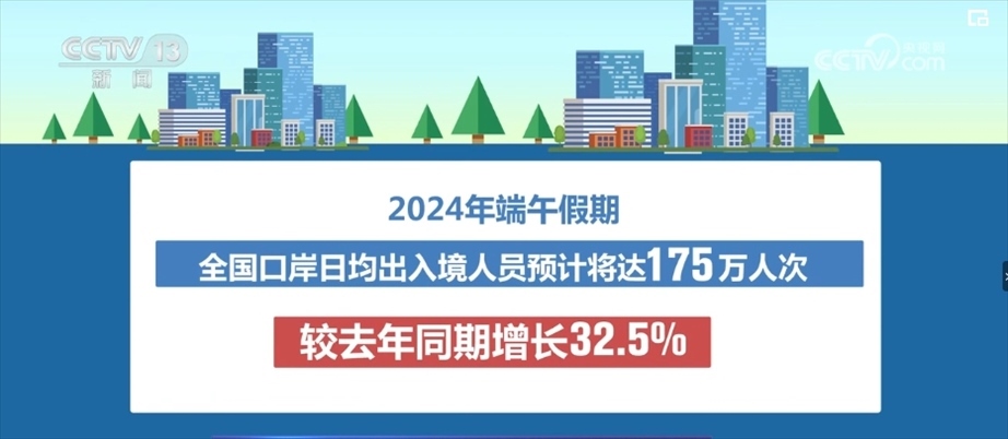央視網(wǎng)消息:記者6月6日從國(guó)家移民管理局獲悉,2024年端午假期,全國(guó)口岸日均出入境人員預(yù)計(jì)將達(dá)175萬人次,較2023年同期增長(zhǎng)32.5%。