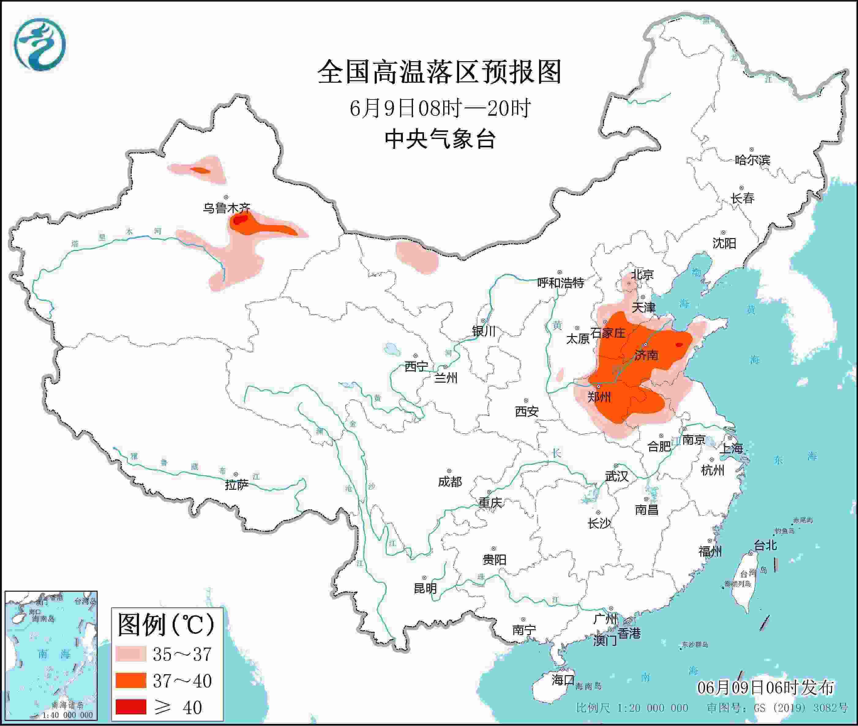 央視網(wǎng)消息:中央氣象臺6月9日06時繼續(xù)發(fā)布高溫黃色預警。預計6月9日白天,內(nèi)蒙古西部、新疆沿天山地區(qū)和南疆盆地、河北中南部、北京、天津西部和南部、山東大部、河南大部、安徽北部、江蘇北部等地有35~36℃高溫天氣,其中,新疆北疆沿天山地區(qū)和吐魯番盆地、河北南部、山東中西部、河南中東部、安徽北部等地部分地區(qū)最高氣溫37~39℃,局地可達40℃以上。