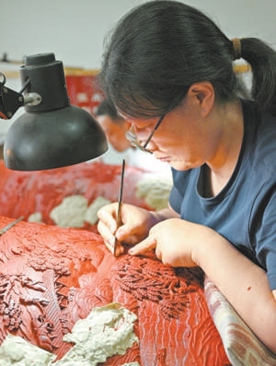 文化傳承揚(yáng)州漆器技藝傳承人進(jìn)行雕花。本報記者 雷 聲攝