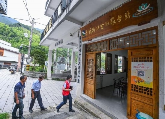 在浙江省麗水市青田縣方山鄉(xiāng)的鄉(xiāng)村振興金融服務(wù)站內(nèi),青田農(nóng)商銀行服務(wù)隊(duì)志愿者上門服務(wù),打通金融服務(wù)“最后一公里”。新華社記者徐昱 攝