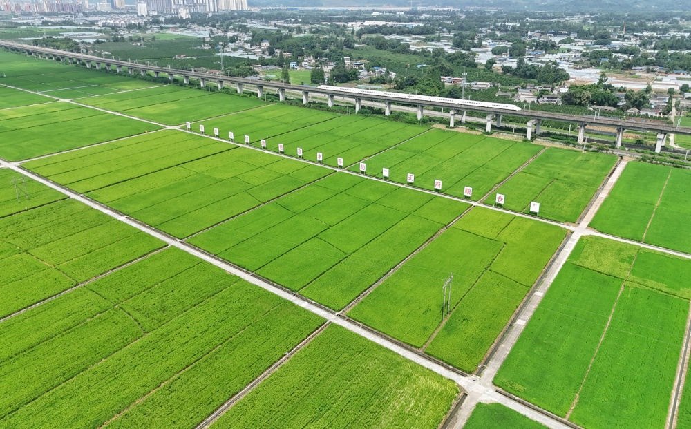 2024年7月26日,一列高鐵列車(chē)從永豐村高標(biāo)準(zhǔn)農(nóng)田上方的高架橋上疾馳而過(guò)(無(wú)人機(jī)照片)。