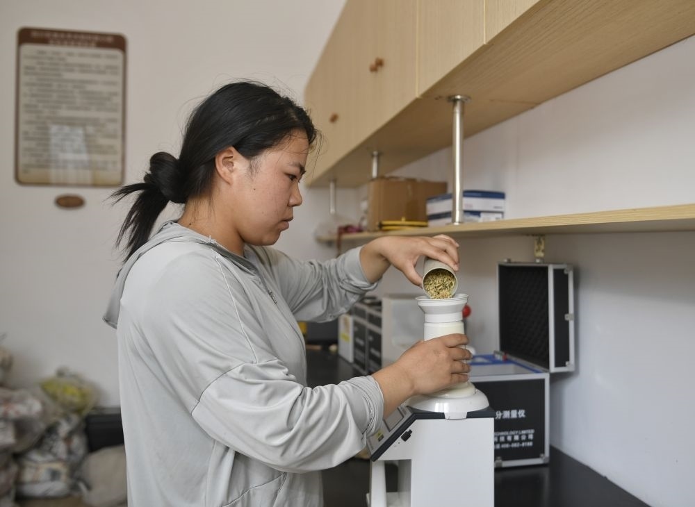 2024年8月22日,在永豐村水稻科技小院,長(zhǎng)期駐守在此的四川農(nóng)業(yè)大學(xué)學(xué)生測(cè)量稻谷含水量。