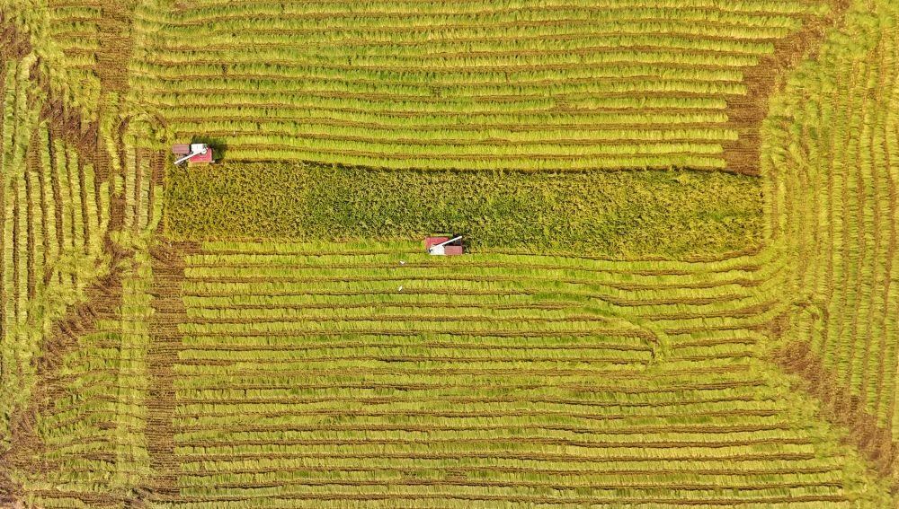2024年8月22日,收割機(jī)在永豐村高標(biāo)準(zhǔn)農(nóng)田內(nèi)收割水稻(無(wú)人機(jī)照片)。