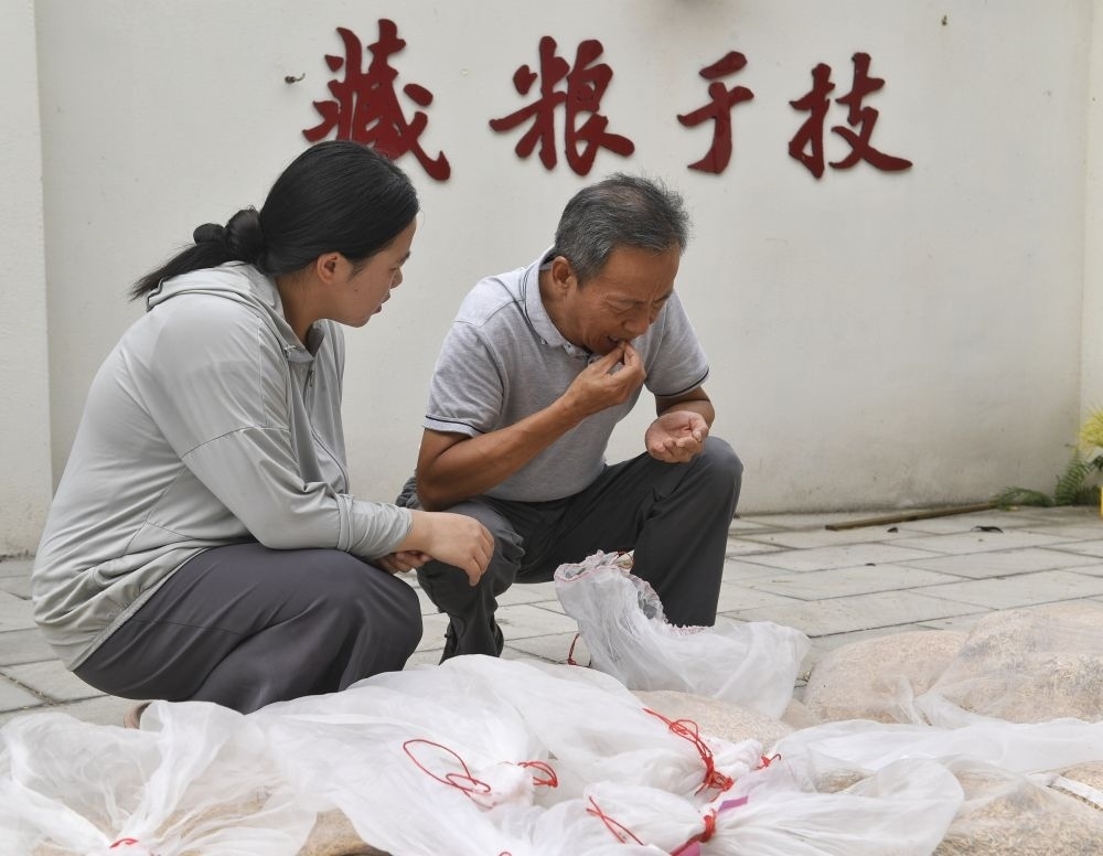 2024年9月10日,農(nóng)業(yè)專(zhuān)家、四川農(nóng)業(yè)大學(xué)教授馬均(右)在永豐村水稻科技小院通過(guò)牙咬感受稻谷晾曬程度。
